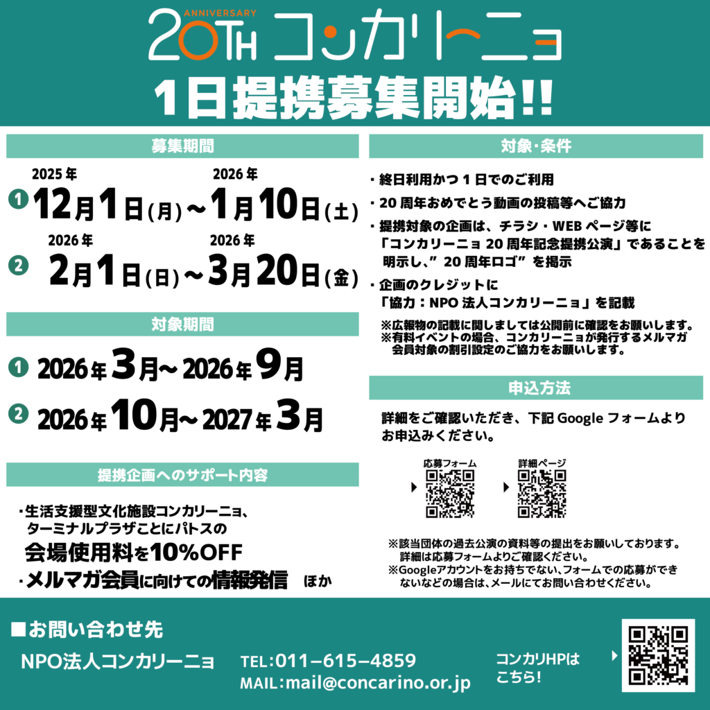 | 対象・条件 | ・終日利用かつ1日でのご利用 ・20周年おめでとう動画の投稿等へご協力 ・提携対象の企画は、チラシ・WEBページ等に「コンカリーニョ20周年記念提携公演」であることを明示し、”20周年ロゴ”を掲示 ・企画のクレジットに「協力:NPO法人コンカリーニョ」を記載 ※広報物の記載に関しましては公開前に確認をお願いします。 ※有料イベントの場合、コンカリーニョが発行するメルマガ会員対象の割引設定のご協力をお願いします。 |