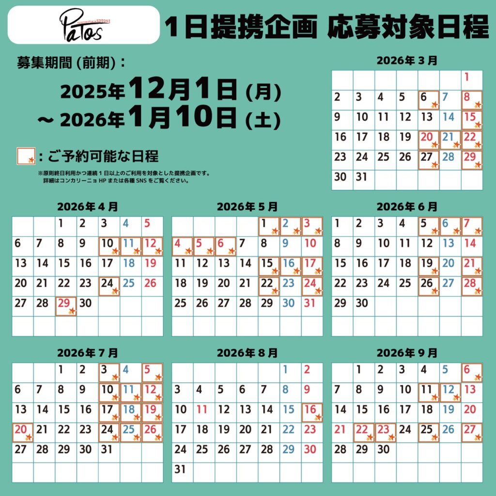 | 提携企画へのサポート内容 | ・生活支援型文化施設コンカリーニョ、 および、ターミナルプラザことにパトスの劇場利用料を10%引き ・メルマガ会員へ向けてイベント情報の配信 など |