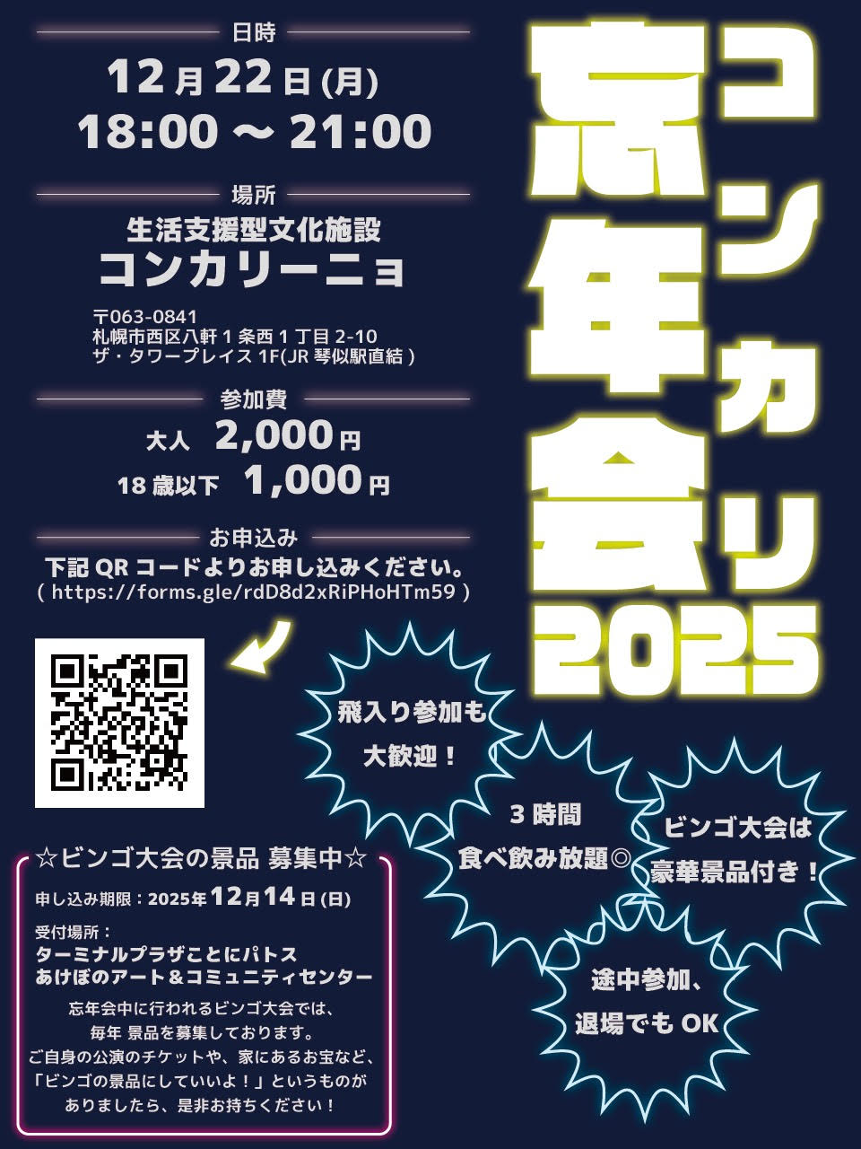 コンカリ忘年会2025!!!!今年も開催します!!コンカリ忘年会2025!!!3時間食べ飲み放題!!!豪華景品付きビンゴ大会も!!! 【日時】 12月22日(月) 18:00~21:00途中参加、退場OKです!! 【料金】大人 2,000円18歳以下 1,000円 【お申込み】お申し込みはコチラ↓https://forms.gle/rdD8d2xRiPHoHTm59飛び入り参加も大歓迎です!!! 【会場】生活支援型文化施設コンカリーニョ(札幌市西区八軒1条西1丁目2−10 ザ・タワープレイス 1F) ⭐ビンゴ大会の景品 募集中⭐忘年会中に行われるビンゴ大会では、毎年、景品を募集しております。ご自身の公演チケットや、家にあるお宝など、「ビンゴの景品にしていいよ!」というものがありましたら、是非お持ちください!≪お申込み期限≫2025年12月14日(日)≪受付場所≫ターミナルプラザことにパトスあけぼのアート&コミュニティセンター