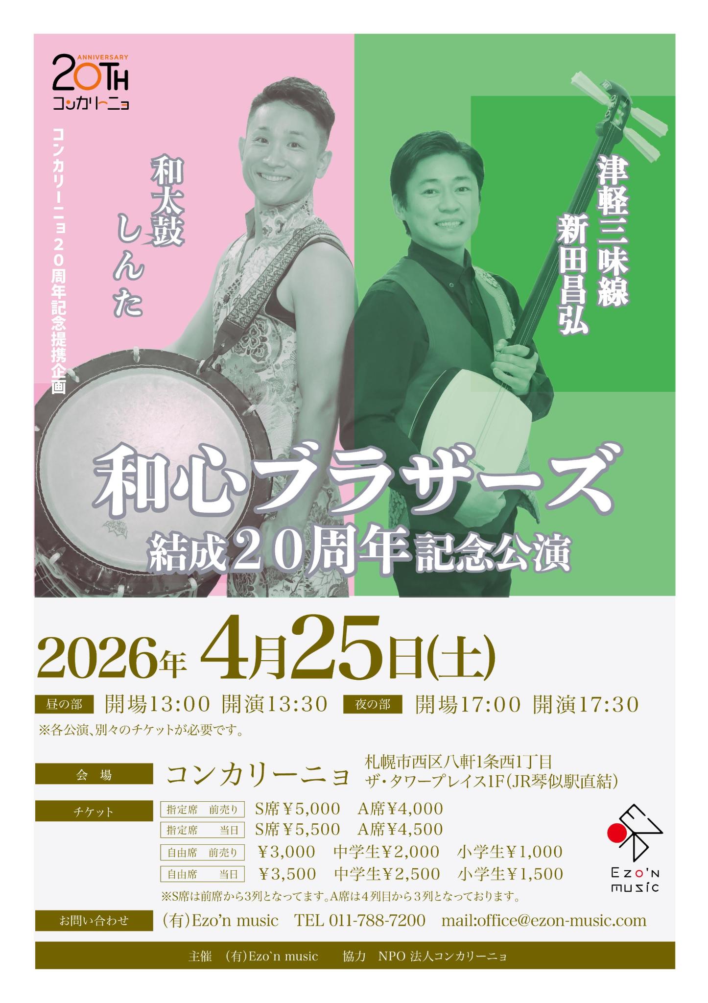 和心ブラザーズ 結成20周年記念公演【日時】2026年4月25日(土)昼の部 開場13:00 開演13:30夜の部 開場17:00 開演17:30【出演】津軽三味線 新田昌弘和太鼓 しんた【チケット】指定席前売り S席5,000円 A席4,000円指定席当日 S席5,500円 A席4,500円自由席前売り 3,000円 中学生2,000円 小学生1,000円自由席当日 3,500円 中学生2,500円 小学生1,500円※S席は前列3列、A席は4列目から3列となっております。【お問い合せ】(有)Ezo'n musicTEL 011-788-7200mail office@ezon-music.com【主催】(有)Ezo'n music【協力】NPO法人コンカリーニョ