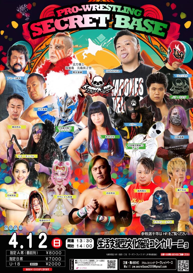 PRO-WRESTLING SECRET BASE「GLAMOROUS GOLDEN WORLD 2026」シークレットベース4度目の北海道!初開催となる琴似コンカリーニョ大会を是非ご観戦ください!皆様のご来場をお待ちしております! 【日時】2026年4月12日(日) 開場 13:00/試合開始 14:00 【出場予定選手】清水基嗣、HANAOKA、フェリスト、アミーゴ鈴木、山下金吾、あきば栞、宇宙銀河戦士アンドロス、ノブ・カセダ、黒田哲広、ミス・モンゴル、ドラゴンユウキ、吉田考志、高西翔太、竹林早苗、ガキにゃん仮面、馬頭ほかげ、瀬戸浩志、他 【料金】指定席A席(最前列)8,000円指定席B席 7,000円※当日1000円UP 【チケット】・SECRET BASE事務局 https://pwsb2009.theshop.jp/・e+ イープラス 【会場】生活支援型文化施設コンカリーニョ(札幌市西区八軒1条西1丁目2−10 ザ・タワープレイス 1F) 【お問合せ】SECRET BASE事務局MAIL:pw.secretbase2009@gmail.com